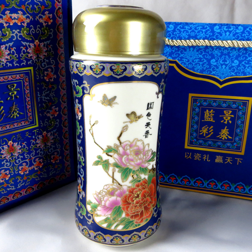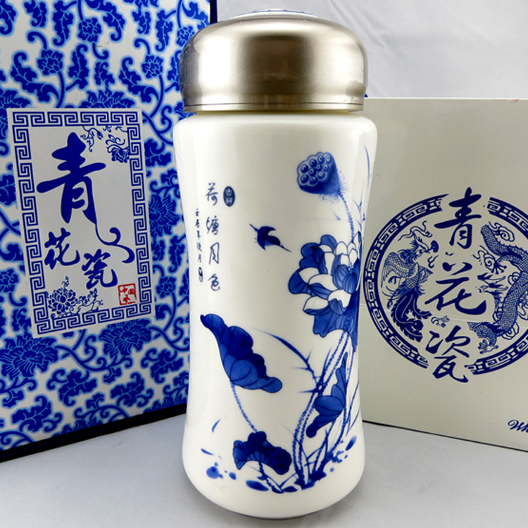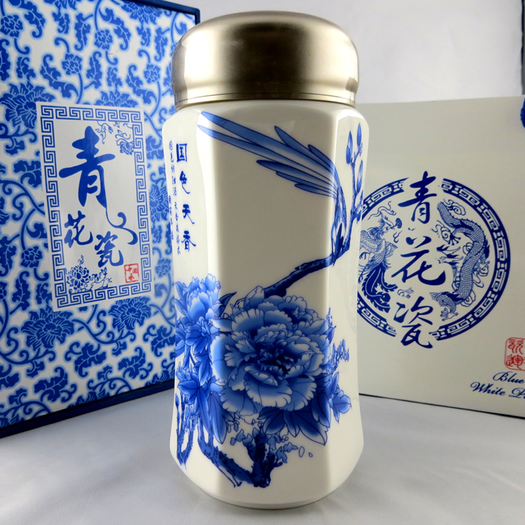 【產品名稱】:傳世青花--真品青花瓷保溫杯 【尺寸】:高度18.8厘米,底部直徑7.7厘米,杯口直徑5.2厘米,容量300-350ml 【產品描述】:本產品全部采用骨質瓷,經一千多度高溫燒制而成,環保健康,對人體無任何傷害。青花瓷上運用天然鈷料在白泥上進行繪畫裝飾,再罩以透明釉,然后在高溫1300攝氏度一次燒成,使色料充分滲透于坯釉之中,呈現青翠欲滴的藍色花紋,顯得幽倩美觀,明凈素雅。 【產品工藝】:青花瓷,是中國傳統元素與現代工藝的完美結合,具有著色力強,發色鮮艷,呈色穩定的特點,胎釉上的紋飾細膩,色澤清晰,青翠欲滴,由內而外透著一種侵透質樸的風骨,一種沉靜歲月的優雅,一種柔韌的堅持。紅陶象征紅紅火火興旺發達和吉祥如意,青花瓷則象征著生生不息波瀾壯闊和放眼天下。