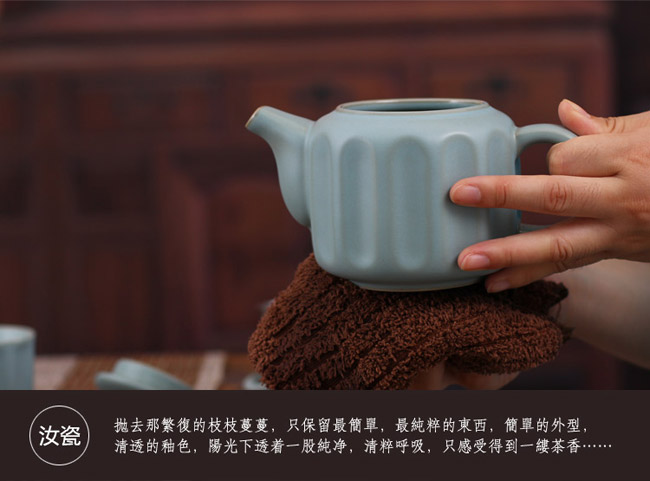 閑暇時,尋一處雅致安靜地,看茶色流動,觀蟬翼隱現,感汝瓷風韻,讓這一抹天青帶你回到那個久遠的年代。拋去那繁復的枝枝蔓蔓,只保留最簡單,最純粹的東西簡單的外型,清透的釉色,陽光下透著一股純凈、清粹呼吸,只感受那一縷茶香……