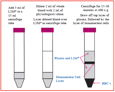 2. 無菌轉移3 mlLSM到15 ml離心管中。 3. 混合2 ml除纖維蛋白血液或肝素處理血液 和2 ml 生理鹽水 4. 仔細的將稀釋血液加入3 mlLSM(室溫)于15ml離心管中,在血液和LSM中形成一個明顯的分層。不要將稀釋血液混合入LSM中。 5. 室溫下400g離心15-30分鐘,離心可以沉淀紅細胞和多核白細胞同時可以再LSM上形成一層單核淋巴細胞,如上圖所示。 6. 吸出淋巴細胞上方2-3mm的血漿。 7. 吸取淋巴細胞層以及它下面一半的LSM和轉移到另外的一個離心管。加入等體積的平衡鹽緩沖液至淋巴細胞離心管中,室溫離心10分鐘,離心速度設定在既不損傷細胞又能沉淀細胞即刻,例如160 - 260 x g(去除LSM和降低血小板的百分比)。 8. 用平衡鹽緩沖液清洗細胞,用適當?shù)呐囵B(yǎng)基重懸細胞。 聯(lián)系人:張鈺 聯(lián)系電話:010-82015225/400-833-9299 傳真:010-62015131