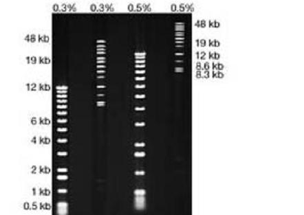 品名:SeaKem Gold Agarose 品牌:Lonza 貨號(hào):50150 SeaKem Gold Agarose瓊脂糖的產(chǎn)品應(yīng)用: • 脈沖場(chǎng)凝膠電泳(PFGE)實(shí)驗(yàn)Pulsed field gel electrophoresis-PFGE • 長(zhǎng)片段DNA的分離Large fragment separation • 巨大堿基DNA即長(zhǎng)片段和超長(zhǎng)片段DNA印跡實(shí)驗(yàn)Blotting of megabase DNA • 高效分離分子量大于600kDa的蛋白Effective for separating proteins >600kDa 簡(jiǎn)介: SeaKem Gold瓊脂糖是一種高凝膠強(qiáng)度,低EEO,標(biāo)準(zhǔn)膠凝溫度的瓊脂糖。這種遺傳學(xué)術(shù)級(jí)別(Genetic Technology Grade,GTG)瓊脂糖最適于脈沖場(chǎng)凝膠電泳法(pulsed field gel electrophoresis,PFGE)快速分辨Mb(megabase)(50kb-10Mb)DNA和常規(guī)電泳方法分辨1-50kb的DNA與PCR產(chǎn)物。因其低EEO特性,SeaKem Gold瓊脂糖中的DNA電泳遷移速度要顯著的高于常規(guī)瓊脂糖凝膠。PFGE的跑膠時(shí)間依使用的緩沖液和瓊脂糖濃度的不同可減少至原電泳時(shí)間的50%。因其高凝膠強(qiáng)度,即使是使用低濃度(0.5%)的SeaKem Gold瓊脂糖凝膠,操作處理依然很方便,從而允許在常規(guī)電泳中分離更大的DNA片斷并減少PFGE中的DNA分離的耗時(shí)。 應(yīng)用: 脈沖場(chǎng)凝膠電泳; 標(biāo)準(zhǔn)凝膠電泳分離大于23kb的DNA片斷; Mb大小DNA印跡。 分析說(shuō)明: 膠凝溫度(1.5%):34.5℃-37.5℃ 硫酸鹽:≤0.10% 凝膠強(qiáng)度(1.0%:≥1800g/cm2 凝膠強(qiáng)度(1.5%):≥3500g/cm2 濕度:≤10% EEO(-Mr):≤0.05 訂購(gòu)信息 :