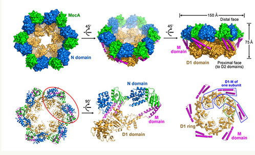 ATP依賴的可調(diào)控蛋白質(zhì)水解廣泛存在于大多數(shù)生命體中,對(duì)于及時(shí)清除機(jī)體內(nèi)的垃圾蛋白以及調(diào)節(jié)蛋白具有十分重要的作用。原核生物中負(fù)責(zé)這一功能的蛋白酶體由調(diào)節(jié)亞基-Clp/Hsp100家族成員同催化亞基ClpP兩部分組成。研究發(fā)現(xiàn),Clp/Hsp100家族蛋白都是以六聚體形式執(zhí)行功能。ClpC是Clp/Hsp100家族的重要成員,含有兩個(gè)AAA+(ATPasesassociatedwithdiversecellularactivities)結(jié)構(gòu)域(核酸結(jié)合結(jié)構(gòu)域),與該家族其它成員不同的是,ClpC的六聚體形成及其進(jìn)一步的激活需要接頭蛋白MecA的參與。利用ATP水解的能量,激活后的六聚體MecA-ClpC分子能夠去折疊特異性蛋白質(zhì)底物,并將生成的去折疊多肽鏈轉(zhuǎn)運(yùn)到ClpP中降解。但是,MecA如何介導(dǎo)ClpC形成六聚體并激活ClpC的分子機(jī)制一直都沒有明確的解釋。