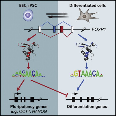 M. Muralidhar Reddy et al. Identification of Candidate IgG Biomarkers for Alzheimer's Disease via Combinatorial Library Screening. Cell, 7 January 2011, 144(1):132-142, doi:10.1016/j.cell.2010.11.054. 3.發(fā)現(xiàn)干細(xì)胞多能性的選擇性剪接開關(guān) 加拿大多倫多大學(xué)研究人員發(fā)現(xiàn)了進(jìn)化上保守的特異的FOXP1選擇性剪接開關(guān),可調(diào)控干細(xì)胞的多能性。研究人員發(fā)現(xiàn)這種剪接開關(guān)產(chǎn)生的FOXP1胚胎干細(xì)胞特異性異構(gòu)體,與典型的FOXP1異構(gòu)體相比,著不同的DNA結(jié)合性質(zhì)。選擇性剪接事件改變了FOXP1胚胎干細(xì)胞特異性異構(gòu)體的DNA結(jié)合性質(zhì),促進(jìn)維持多能性所需的轉(zhuǎn)錄因子基因的表達(dá),包括OCT4、NANOG、NR5A2和GDF3,同時(shí)抑制胚胎干細(xì)胞分化所需的基因。同時(shí),研究小組還發(fā)現(xiàn)FOXP1胚胎干細(xì)胞特異性異構(gòu)體促進(jìn)體細(xì)胞高效重編程為誘導(dǎo)性多功能干細(xì)胞(iPSC)。