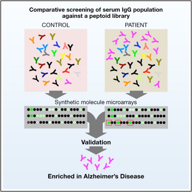Katsuhiko Hayashi et al. Reconstitution of the Mouse Germ Cell Specification Pathway in Culture by Pluripotent Stem Cells. Cell,04 August 2011,146(4):519-532, doi:10.1016/j.cell.2011.06.052. 2.鑒定出阿爾茨海默病Alzheimer's disease的生物標(biāo)記 美國(guó)研究人員利用一種一般性和無(wú)偏差的方法---組合文庫(kù)篩選(Combinatorial Library Screening)來(lái)鑒定出診斷上有用的抗體,而避免進(jìn)行抗原鑒定。該方法涉及利用非自然的合成分子組合文庫(kù)對(duì)病人血清樣品和對(duì)照樣品進(jìn)行比較性篩選,這樣就可鑒定出病人血清樣品中要比和對(duì)照樣品中保留極其多IgG抗體的分子,隨后利用這些分子作為捕獲試劑來(lái)捕獲診斷上有用的抗體。研究人員利用多發(fā)性硬化癥(multiple sclerosis)小鼠模式動(dòng)物和證實(shí)這種方法的實(shí)用性,并利用該方法在阿爾茨海默病小鼠模式動(dòng)物中鑒定出兩種候選的IgG抗體生物標(biāo)記。