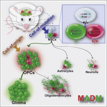 Mathieu Gabut et al. An Alternative Splicing Switch Regulates Embryonic Stem Cell Pluripotency and Reprogramming. Cell, 15 September 2011, 147(1):132-146, 4.追蹤神經(jīng)膠質(zhì)瘤的起源 美國(guó)研究人員利用雙標(biāo)記嵌合分析(Mosaic Analysis with Double Markers,MADM)---該技術(shù)的精髓在于用綠色熒光蛋白明確標(biāo)示突變細(xì)胞,還有一個(gè)關(guān)鍵特色就是無(wú)論一個(gè)突變的綠色細(xì)胞何時(shí)產(chǎn)生,總是同時(shí)產(chǎn)生一個(gè)正常的紅色細(xì)胞---來(lái)分析神經(jīng)膠質(zhì)瘤(glioma)的起源。他們將膠質(zhì)瘤病人體內(nèi)發(fā)現(xiàn)的兩種流行突變p53與NF1導(dǎo)入神經(jīng)干細(xì)胞(neural stem cells, NSCs)中,對(duì)源自神經(jīng)干細(xì)胞的所有細(xì)胞系所作的進(jìn)一步分析清楚地顯示了少突膠質(zhì)前體細(xì)胞(Oligodendrocyte precursor cells,OPCs)是該腫瘤的來(lái)源細(xì)胞,因?yàn)槿魏慰梢姷哪[瘤標(biāo)志可被檢出之前,變異的綠色少突膠質(zhì)前體細(xì)胞的數(shù)量大大超過(guò)了其正常的紅色對(duì)應(yīng)物數(shù)量,足足超了130倍。為了進(jìn)一步證實(shí)這點(diǎn),研究人員也將p53與NF1突變直接導(dǎo)入小鼠少突膠質(zhì)前體細(xì)胞,結(jié)果發(fā)現(xiàn)這些小鼠產(chǎn)生神經(jīng)膠質(zhì)瘤,從而再次證實(shí)少突膠質(zhì)前體細(xì)胞是神經(jīng)膠質(zhì)瘤的來(lái)源。