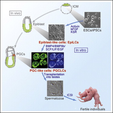 1.利用誘導(dǎo)性多功能干細(xì)胞構(gòu)建出小鼠精子祖細(xì)胞 日本京都大學(xué)研究人員通過(guò)體外誘導(dǎo)胚胎干細(xì)胞(ESCs)和誘導(dǎo)性多功能干細(xì)胞(iPSCs),形成原始生殖細(xì)胞樣細(xì)胞(primordial germ cell-like cells, PGCLCs),最后進(jìn)一步分化,通過(guò)體內(nèi)植入不能生育的小鼠睪丸中,產(chǎn)生了外觀正常的精子。將這些精子注射到雌性小鼠的卵細(xì)胞中,不久雌性小鼠生出了健康的小鼠后代。