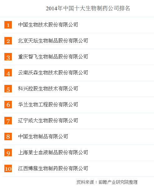 隨著新產品研發經費支出的快速穩定增長,2000-2011年我國生物制藥行業大中型企業新產品產銷規模呈較快增長趨勢。2011年行業大中型企業新產品產值達215.47億元,同比增長47.35%,2000-2011年的復合增長率為30.25%;新產品銷售收入為204.81億元,同比增長47.59%,2000-2011年的復合增長率為32.09%。 前瞻產業研究院《2014-2018年中國生物制藥行業技術研發與新品上市分析報告》統計數據顯示,2014年中國十大生物制藥企業排行榜如下(排名不分先后):