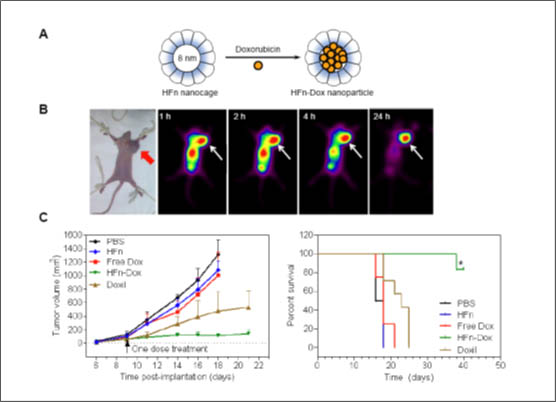 圖1:鐵蛋白納米載體靶向輸送抗癌藥物(A)鐵蛋白納米載體裝載抗癌藥物;(B)攜帶抗癌藥物的鐵蛋白納米粒精確靶向腫瘤;(C)裝載抗癌藥物的鐵蛋白納米粒有效治療結腸癌,延長生存期。 化療是當前癌癥病人首選的治療方式,然而化療中存在的主要問題是毒副作用大。如何提高藥物的療效、降低其副作用,一直是腫瘤藥物研究的關鍵和難題。隨著納米科學的蓬勃發(fā)展,利用納米技術改良藥物的性狀,使其精準地殺傷腫瘤細胞,減少對正常組織的損傷,是腫瘤靶向治療的核心。為了獲得具有主動靶向功能的藥物載體,人們通常在納米材料的表面修飾一些功能基團,如特異識別腫瘤的抗體等。然而,修飾過程不僅復雜、成本高、而且修飾后的載體分子容易聚集,造成產品不均一。另外,納米材料的生物相容性差也是引起免疫系統(tǒng)識別和清除的重要原因。 閻錫蘊課題組依據人體天然鐵蛋白獨特的殼核結構,仿生合成了24 聚體鐵蛋白納米粒子,其外殼直徑12nm,內腔為8nm能有效裝載化療藥物阿霉素。鐵蛋白納米載體有3個突出的特點:(1)由人體天然蛋白質自組裝而成的藥物載體;(2)無需在其表面做任何修飾,即可直接識別并殺傷腫瘤;(2)動物實驗結果表明,單劑量給藥就能有效抑制結腸癌、乳腺癌及黑色素瘤的生長。與目前國際上唯一應用于臨床的脂質體阿霉素納米藥物相比,療效更好、存活率長而且毒副作用小。 這種新型藥物載體不僅能夠在腫瘤組織富集,而且還使腫瘤細胞內的藥物濃度提高十倍,使阿霉素所致的心臟毒性降低七倍。進一步機制研究發(fā)現(xiàn),鐵蛋白載體結合腫瘤細胞膜上的轉鐵蛋白受體,是其靶向腫瘤的分子基礎。另外,鐵蛋白納米粒子作為天然蛋白質,生物相容性好,不易引起機體的免疫排斥反應,因此毒性小。本文為天然蛋白納米粒作為高效低毒的靶向載體的研究提供了新思路。 原文摘要: H-ferritin–nanocaged doxorubicin nanoparticles specifically target and kill tumors with a single-dose injection Minmin Liang, Kelong Fan, Meng Zhou, Demin Duan, Jiyan Zheng, Dongling Yang, Jing Feng and Xiyun Yan An ideal nanocarrier for efficient drug delivery must be able to target specific cells and carry high doses of therapeutic drugs and should also exhibit optimized physicochemical properties and biocompatibility. However, it is a tremendous challenge to engineer all of the above characteristics into a single carrier particle. Here, we show that natural H-ferritin (HFn) nanocages can carry high doses of doxorubicin (Dox) for tumor-specific targeting and killing without any targeting ligand functionalization or property modulation. Dox-loaded HFn (HFn-Dox) specifically bound and subsequently internalized into tumor cells via interaction with overexpressed transferrin receptor 1 and released Dox in the lysosomes. In vivo in the mouse, HFn-Dox exhibited more than 10-fold higher intratumoral drug concentration than free Dox and significantly inhibited tumor growth after a single-dose injection. Importantly, HFn-Dox displayed an excellent safety profile that significantly reduced healthy organ drug exposure and improved the maximum tolerated dose by fourfold compared with free Dox. Moreover, because the HFn nanocarrier has well-defined morphology and does not need any ligand modification or property modulation it can be easily produced with high purity and yield, which are requirements for drugs used in clinical trials. Thus, these unique properties make the HFn nanocage an ideal vehicle for efficient anticancer drug delivery.