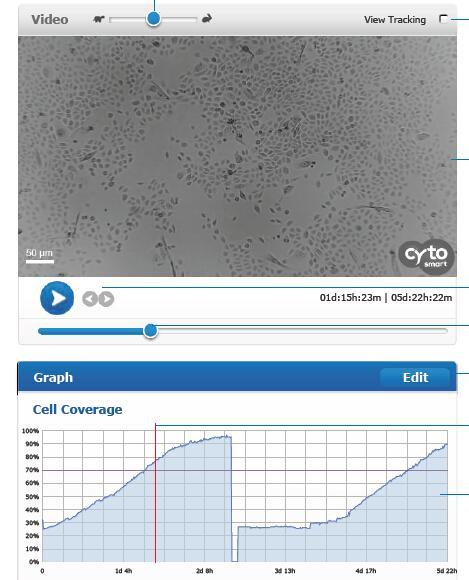 按照圖片分析出的細胞覆蓋率時間曲線 CytoSMART™可以設置間隔一定時間進行拍照,然后以延時攝影的方式將照片連續播放,自帶圖像分析功能,可以對細胞鋪滿的匯合比例進行分析,很容易根據細胞生長曲線來計算倍增時間和確定傳代時間。以前細胞培養的好壞主要依靠實驗人員的經驗,有了CytoSMART™的輔助,科研人員能夠得到更多有關細胞培養的參數(生長速度、倍增時間、傳代時機等),有助于獲得穩定而可靠的實驗數據。
