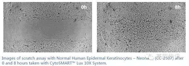 CytoSMART™還可以對培養箱中的溫度進行監測,能夠提供細胞培養過程中的溫度數據,并且客戶可以在軟件中設定細胞的匯合比例和溫度報警提示,當達到設定的值時,軟件會以郵件的形式提醒實驗人員。 舉兩個應用實例: 應用場景1.細胞劃痕實驗:劃痕試驗是細胞生物學中最常見的實驗方法之一,用于檢測細胞遷移能力。CytoSMART™能夠幫助您非常完美的完成劃痕試驗,全程記錄細胞的遷移情況,避免錯過拍照的最佳時機。