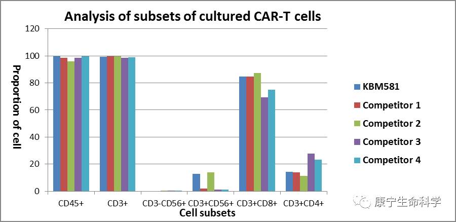 另一個國內著名CAR-T細胞研發企業對581和Competitor2 的對比實驗發現,581與Competitor2培養的CAR-T細胞擴增倍數、細胞活率及表型(CD3/CD4/CD8亞群比例,Tn/Tcm/Tem亞群比例,PD-1+細胞比例等)方面沒有顯著差異,二者都可以支持T細胞尤其是CAR-T細胞的高效擴增。