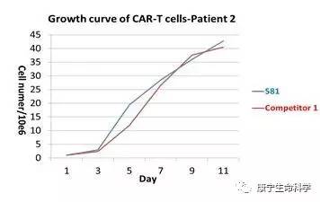 隨后研究人員比較了581與Competitor1在普通未接受放、化療B-ALL病人樣本中,CAR-T細胞的擴增情況。用同樣的分離、刺激和培養方法擴增11天,581體系中CAR-T細胞擴增42.8倍,高于Competitor1的40.5倍,生長曲線顯示581具有推遲的對數生長期和更高的擴增潛能(Figure2,由于回輸的需要,細胞未繼續擴增)。在其他B-ALL病人和健康人樣本中,研究人員也獲得了相似的結果。