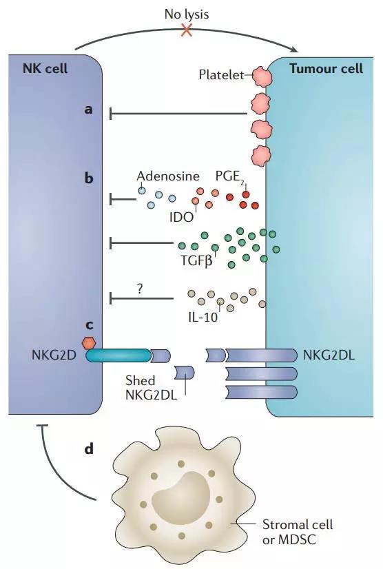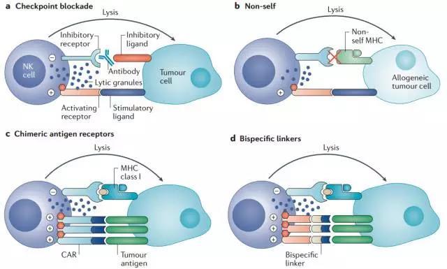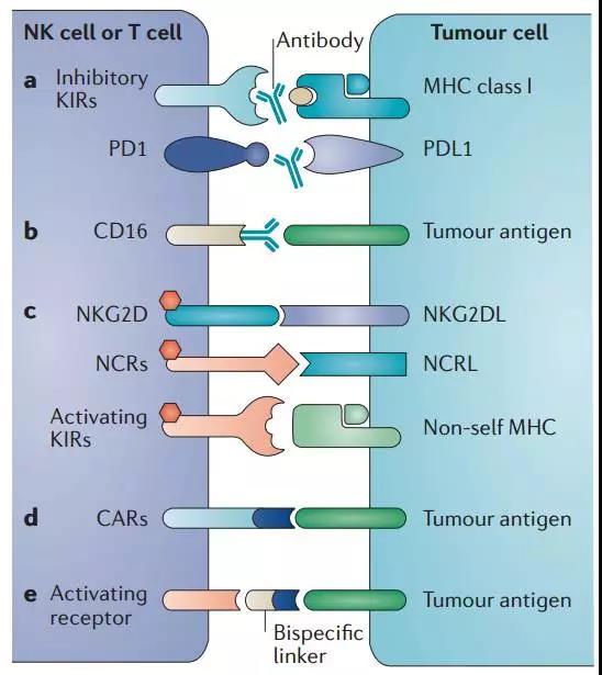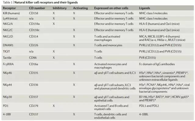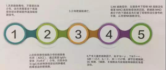 NK細胞又稱自然殺傷細胞(natural killer cell,NK細胞),是機體內重要的免疫細胞,NK細胞形態上屬于大顆粒淋巴細胞,來源于骨髓,是除T細胞、B細胞之外的第三大類淋巴細胞,約占血液中所有免疫細胞(白細胞數量)的15%,屬于天然免疫系統的核心細胞,主要分布于外周血、肝臟和脾臟,在人體內NK細胞主要特征為CD3-CD56+淋巴細胞群,其中血液中主要為CD16+CD56dim亞型(根據細胞上CD56分子表達密度的差異,將NK細胞分為CD56dim和CD56bright兩個亞群;CD56dim占NK細胞90%以上,主要為細胞毒作用,表達中度親和力的IL-2受體(IL-2R),具有更強的殺傷活性;CD56bright可產生大量細胞因子,主要起免疫調節作用,高表達IL-2R)。 NK細胞是體內負責殺傷老化、受病毒感染、腫瘤等異常細胞的最主要“戰士”。NK細胞與人體其他150多種白細胞都不同,它不需要接受免疫系統的特殊指令,也不需要其他細胞的配合,自己單獨就能識別和攻擊外來細胞、癌細胞和病毒。循環的NK細胞通常處于休眠狀態,一旦被激活,它們會滲透到組織中,分泌穿孔素及腫瘤壞死因子,攻擊腫瘤細胞和病毒感染細胞 NK細胞是人體抵抗癌細胞和病毒感染的第一道防線,可非特異性直接殺傷腫瘤細胞,這種天然殺傷活性既不需要抗原致敏,也不需要抗體參與,且無MHC限制。除了具有強大的殺傷功能外,還具有很強的免疫調節功能,與機體其他多種免疫細胞相互作用,調節機體的免疫狀態和免疫功能。臨床研究發現NK細胞過繼免疫治療惡性腫瘤具有良好的應用前景,對多種實體瘤和血液系統惡性腫瘤均有一定效果。 相關詞匯: 過繼免疫療法(adoptive immunotherapy)是取對腫瘤有免疫力的供者淋巴細胞轉輸給腫瘤者,或取患者自身的免疫細胞在體外活化、增殖后,再轉輸入患者體內,使其在患者體內發揮腫瘤作用。 T細胞受體(TCR)在識別APC細胞或者靶細胞上的MHC分子所提呈的抗原肽時,不僅識別抗原肽,還要識別與抗原肽結合的MHC分子類型,此現象即MHC限制性(MHC restriction)。 注:APC細胞是抗原提呈細胞指T細胞在識別Ag遞呈細胞傳遞的抗原信息時,必須先識別遞呈細胞上的MHC抗原類型,如TH細胞識別MHC-Ⅱ類抗原,而TC細胞只識別MHC-Ⅰ類抗原,之后才獲取抗原信息的現象。 NK細胞識別自我與非我并不需要體細胞基因重排產生識別不同抗原的克隆,而是表達多種受體執行功能。 NK細胞受體主要包括免疫球蛋白超家族(如KIR),C型凝集素家族如NKG2受體,天然細胞毒性受體(NCR):NKp46、NKp44和NKp30,下表例舉主要的受體及其調節功能: NK可釋放穿孔素、顆粒酶,穿孔素在靶細胞表面穿孔,使顆粒酶b進入靶細胞誘導靶細胞凋亡。同時分泌大量的細胞因子,如ifn-v、tnf-x、gm-csf、il-3、m-csf等,直接作用于靶細胞,或通過進一步激活其他種類免疫細胞攻擊靶細胞。并可表達可以誘導細胞凋亡的蛋白(fasl)和腫瘤壞死因子相關凋亡誘導配體(trail),使靶細胞進入程序性凋亡狀態。 NK細胞治療流程 NK細胞的“動態平衡”狀態受細胞表面多種受體蛋白的調控,簡言之,分為2類:殺傷細胞活化受體(KAR)和殺傷細胞抑制受體(KIR)。 圖a. 正常情況下,KAR與自身細胞上多糖類抗原結合產生活化信號,同時KIR與MHC I類分子結合,產生抑制信號且占主導地位,以保證自身組織細胞不被破壞,阻止NK對自身健康細胞的殺傷。 圖b. 當細胞表面MHC I類分子發生改變或減少缺失(腫瘤細胞或其他損傷的細胞為逃逸獲得性免疫追殺而下調MHC消除抑制信號),影響與KIR結合,不能產生抑制性信號,NK則活化,釋放溶解性顆粒產生殺傷效應(MHC I丟失自我) 。 圖c. 即使存在抑制信號,腫瘤細胞亦可通過過表達表面抗原與KAR結合,腫瘤細胞可以通過激活NK細胞受體來表達被誘導的應激配體,此時活化信號超過抑制信號,繼而激活NK細胞殺傷靶細胞。 圖d. NK細胞還表達IgG1和IgG3的低親和力受體FcγRIII(CD16),可與腫瘤抗原特異性抗體Fc段結合,介導NK細胞識別并殺傷被抗體包被的腫瘤細胞,亦稱為抗體依賴性細胞介導的細胞毒作用(antibody dependentcell-mediated cytotoxicity, ADCC),ADCC也是NK細胞殺傷靶細胞的主要方式。 目前認為NK細胞主要通過以下途徑發揮殺傷作用: 1.NK細胞直接通過胞吐作用釋放穿孔素和顆粒酶等細胞毒性顆粒,活化半胱天冬酶(caspase)途徑誘導靶細胞凋亡; 2.活化NK細胞表達Fas(CD95)配體和TRAIL(TNF related apoptosis inducing ligand,腫瘤壞死因子相關誘導凋亡配體)分子,誘導CD95+靶細胞和TRAIL受體陽性的靶細胞通過內源酶的級聯反應發生凋亡; 3.細胞因子介導的殺傷作用,NK細胞能合成和分泌多種細胞因子,如IFNγ、TNFα、IL1、IL5、IL8、IL10和GCSF; 4. ADCC作用。 鑒于NK細胞自身的作用機制,在腫瘤免疫治療中,主要通過以下策略來促使NK細胞發揮最大的作用: 1,免疫檢查點抑制劑,解除NK細胞的抑制信號; 2,使用NK細胞進行癌癥治療; 3,嵌合抗原受體(CAR)技術與NK細胞結合; 4,雙特異性分子聯結NK細胞活化受體和腫瘤細胞。 圖a. 某些激活的NK細胞表達PD1和CTLA4。研究者在多發性骨髓瘤患者體內檢測到其NK細胞表達PD1,應用PD1單抗(CT-011)后能修復NK細胞介導的抗腫瘤效應;此外,應用PDL1的IgG1單抗還可能激發NK細胞的ADCC。NK細胞表面KIR類的抑制性受體(KIR2DL1, KIR2DL2 和KIR2DL3)可與MHC I類分子結合,抑制NK細胞活化,體外實驗表明,應用IPH2102單抗阻斷KIR2DL1-3,可以增加NK細胞的抗腫瘤活性(作用機制圖a所示)。在AML和MM的臨床I-II期研究已證實anti-KIR的安全性,雖然目前anti-KIR單獨應用沒