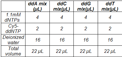 1.Label four 1.5 mL microfuge tubes “ddA, ddC, ddG, ddT” for the respective termination mixes.
