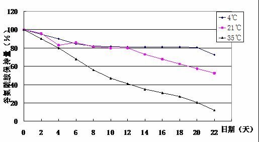 1) 過濾后的完全培養液,即添加了血清、谷氨酰胺、抗生素等的培養液要盡快使用,一般在2-3周內使用完。培養液中的L-谷氨酰胺是不穩定的,不同溫度L-谷氨酰胺的降解見下圖