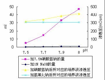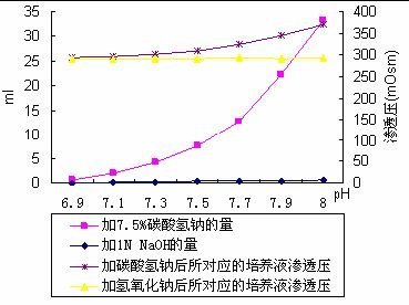 9) 建議用1 N HCl或1 N NaOH來調節培養基的pH,因為用碳酸氫鈉來調對培養液的滲透壓影響比較大。如下圖所示: