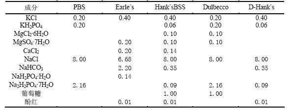 平衡鹽溶液(balanced salt solution,BSS )簡稱鹽溶液,集緩沖液的緩沖能力、生理鹽水的等滲性以及培養液的營養供應特點于一體,兼具維持滲透壓、緩沖和調節溶液的酸堿度、同時供給細胞生存所必需的能量和無機離子成分的作用。各種BSS的緩沖系統有所不同,其中以Hank’s液和Earle’s液為例,它們主要差別在于碳酸氫鈉的水平,在Earle’s (2.2 g/L)中比在Hank’s (0.35 g/L) 中高。碳酸氫鈉需用高水平的CO2平衡,以維持溶液的pH值。Eagles液在空氣水平的CO2 中,溶液會變堿,Hank’s液在CO2培養箱中會變酸。如果希望在CO2培養箱中保存組織,需要用Earle’s液,。如果僅僅是清洗將要在細胞培養基中儲存的組織,用Hank’s液就可以了。