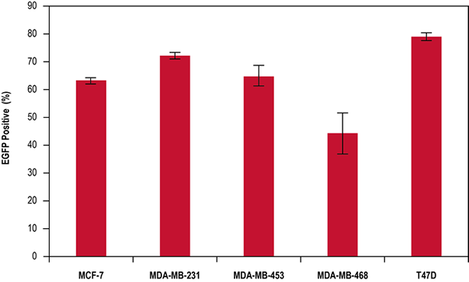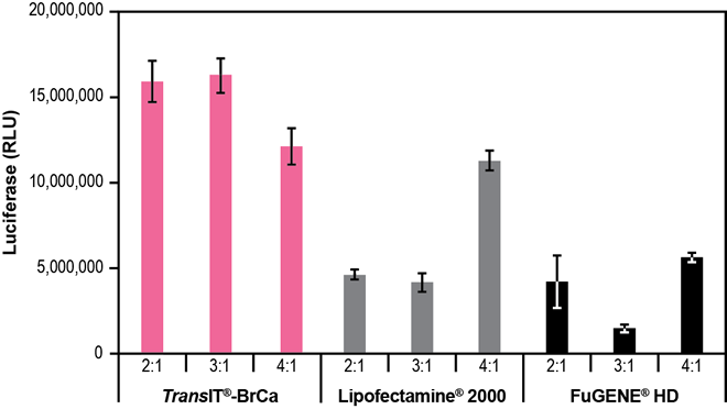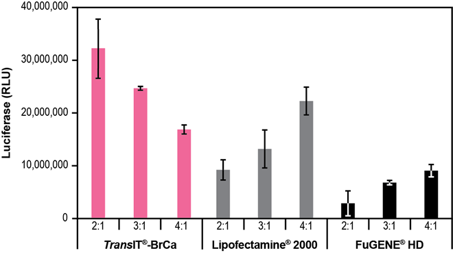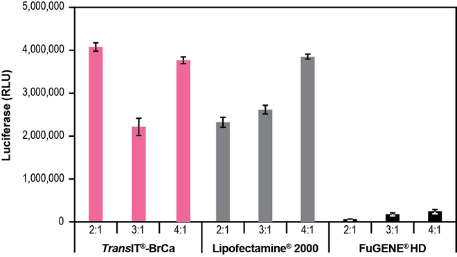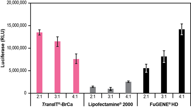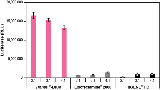 圖 6 T47D 特性 · 卓越的 DNA 傳遞 - 在以下乳腺癌細胞類型中實現高表達水平,包括:MCF-7、MDA-MB-231、MDA-MB-453、MDA-MB-468 和 T47D · 低細胞毒性配方 - 維持細胞密度,并減少毒性引起的實驗偏差 · 系統性驗證 - 由 Mirus Bio 科學家開發,他們擁有近 20 年的基因傳遞專長 描述 · TransIT®-BrCa 轉染試劑是目前市面上首款專用的乳腺癌細胞系特異性試劑。雖然它能高效地傳遞到許多乳腺癌細胞類型,但同時也保持了低細胞毒性,從而減少實驗偏差。 圖 2-6 與其他轉染試劑相比,TransIT®-BrCa 轉染試劑在乳腺癌細胞中表現出更高的熒光素酶表達。